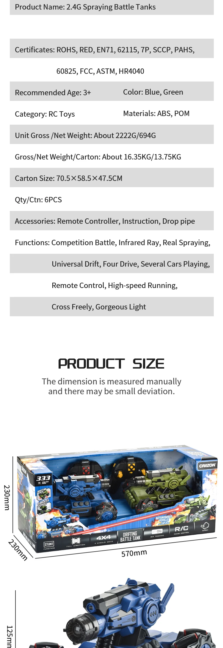 | Product name | 2.4G Spraying Battle Tanks |