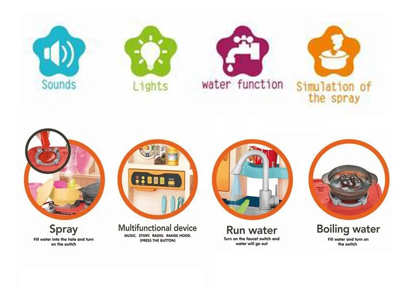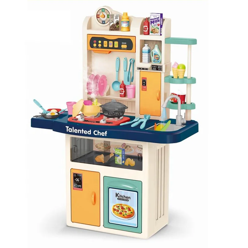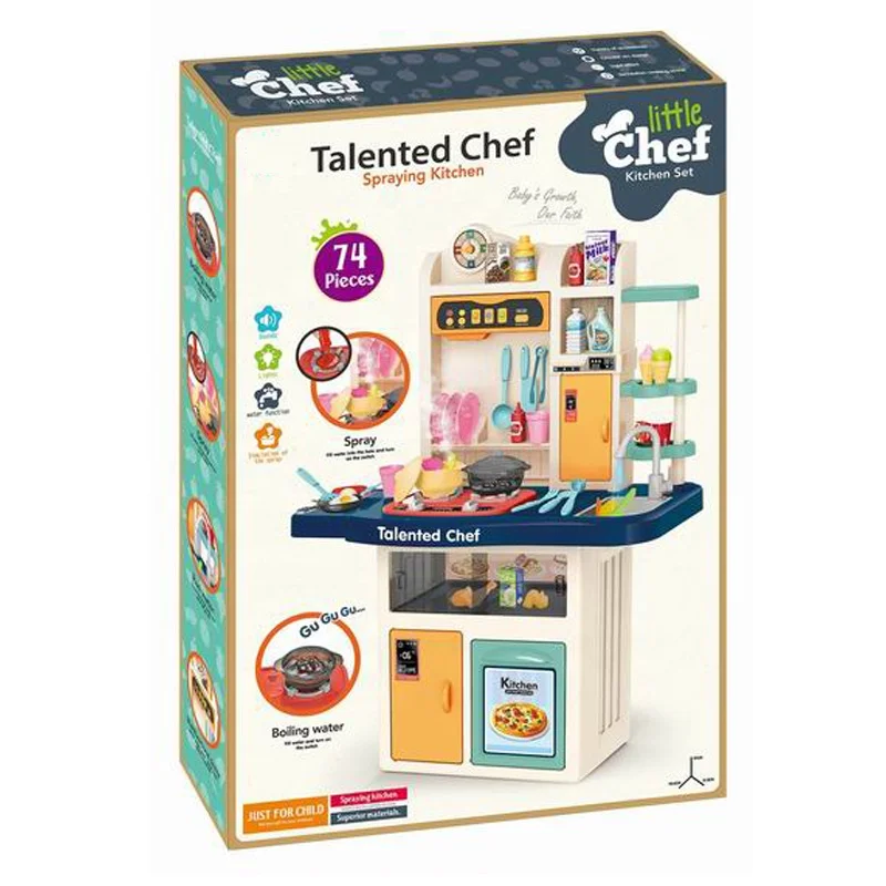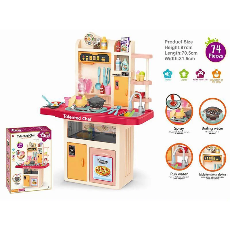 | Description | 74 PCS Running Water Mist Spray Boiling Water Cookware Tableware Kids Kitchen Set Toy with Music and Light Function |