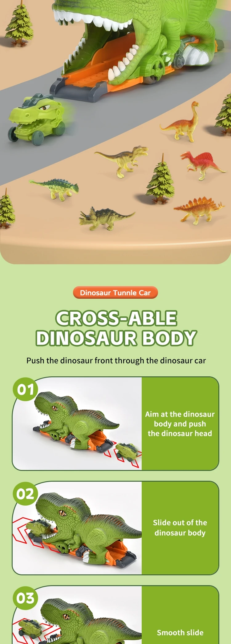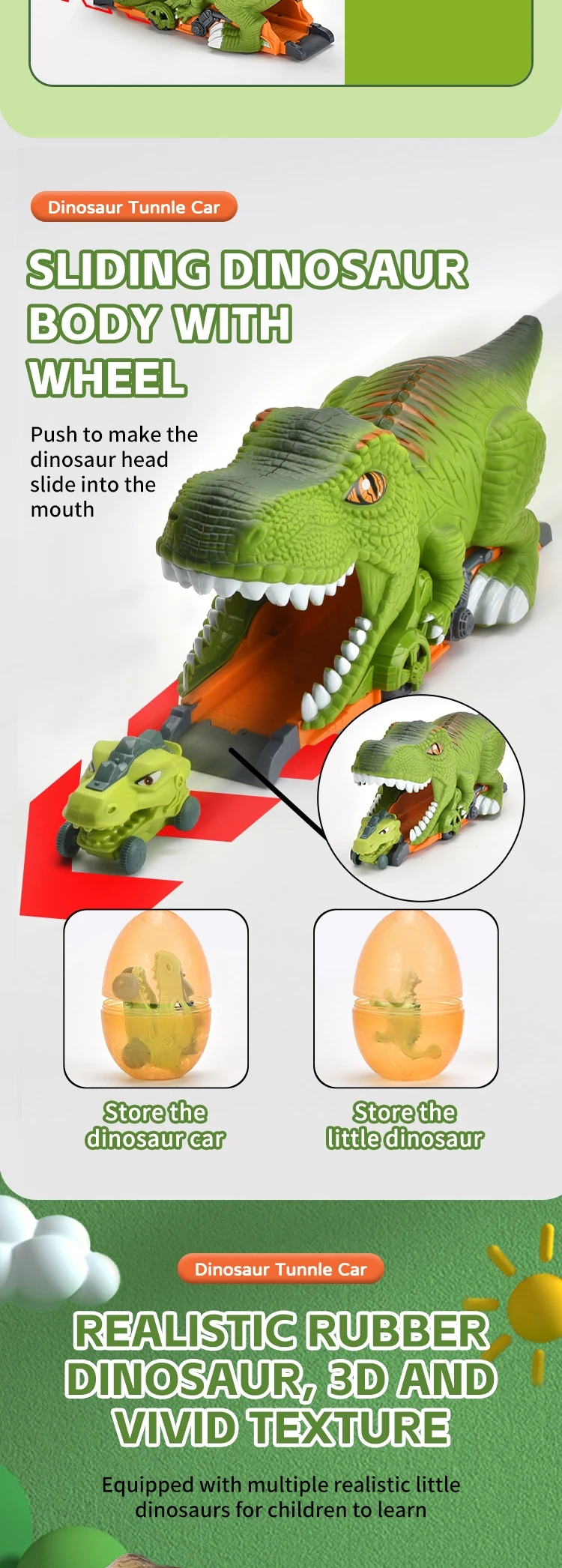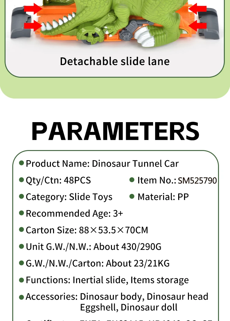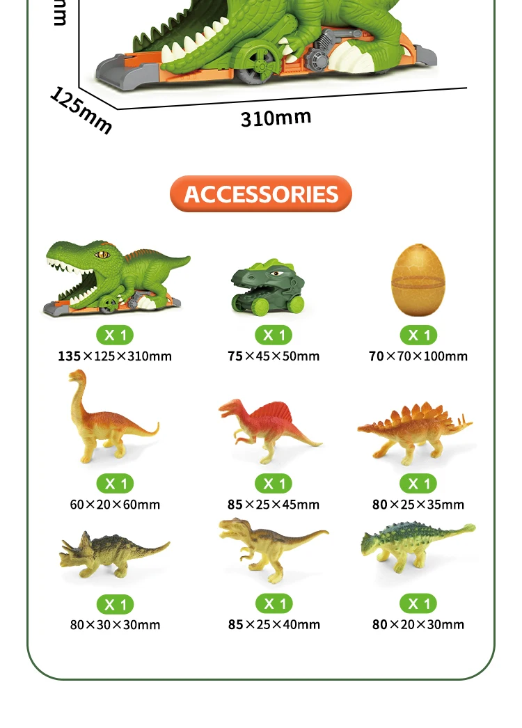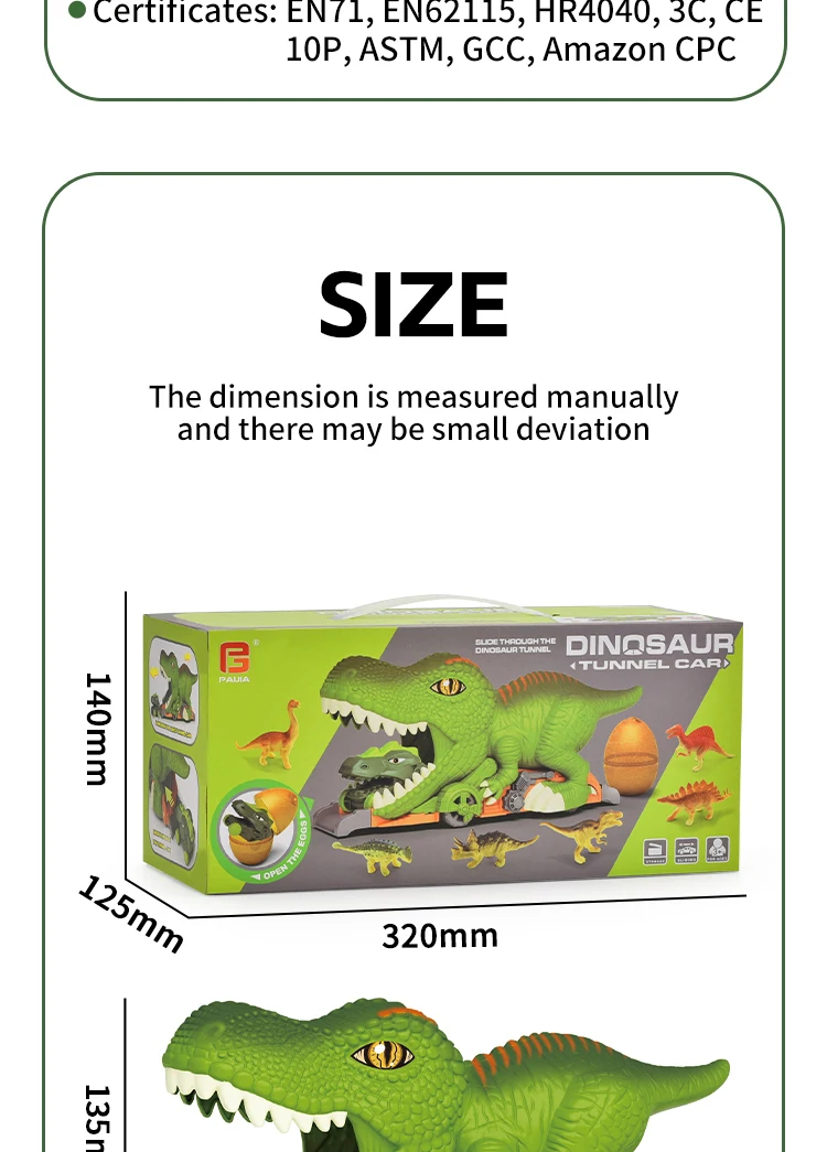 | Packaging Details | 1 piece/ Window Box, 10 pcs/ Carton, can change the quantity per carton, New Arrival Dinosaur Tunnel Car 3D Small Dinosaur Model Kid Inertial Slide Track Friction Toy Vehicle with Egg |