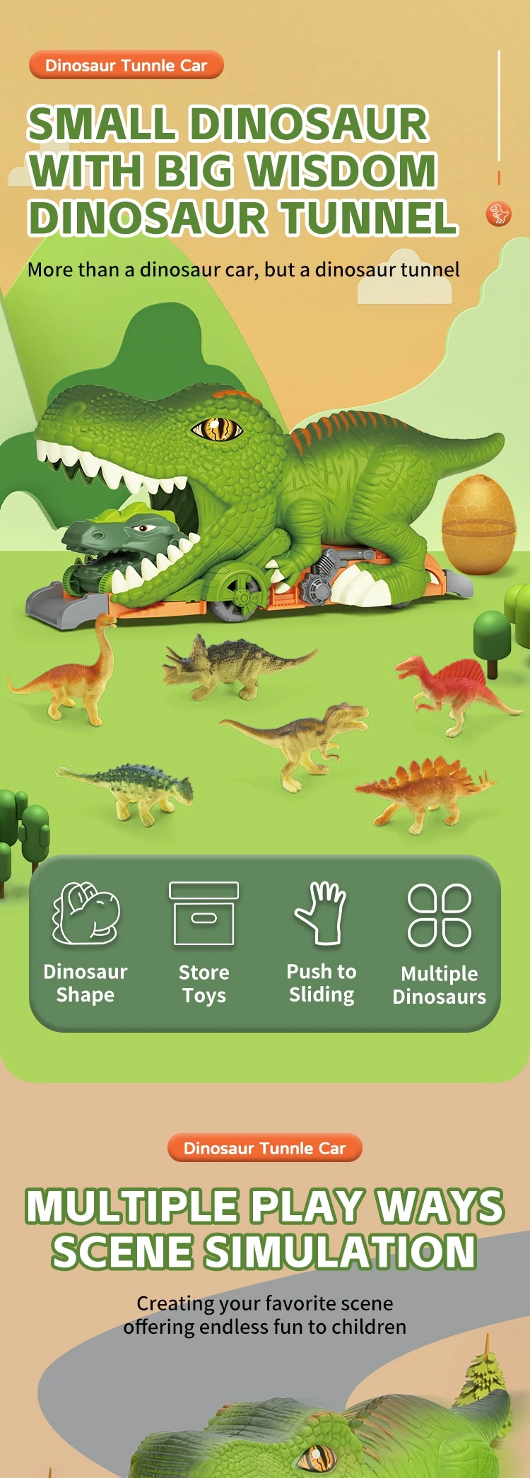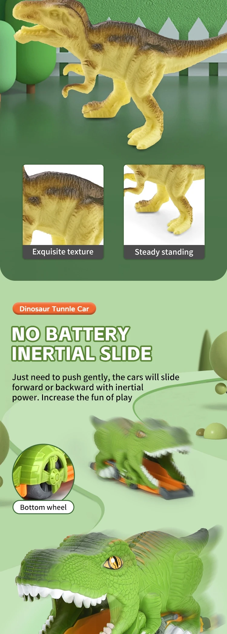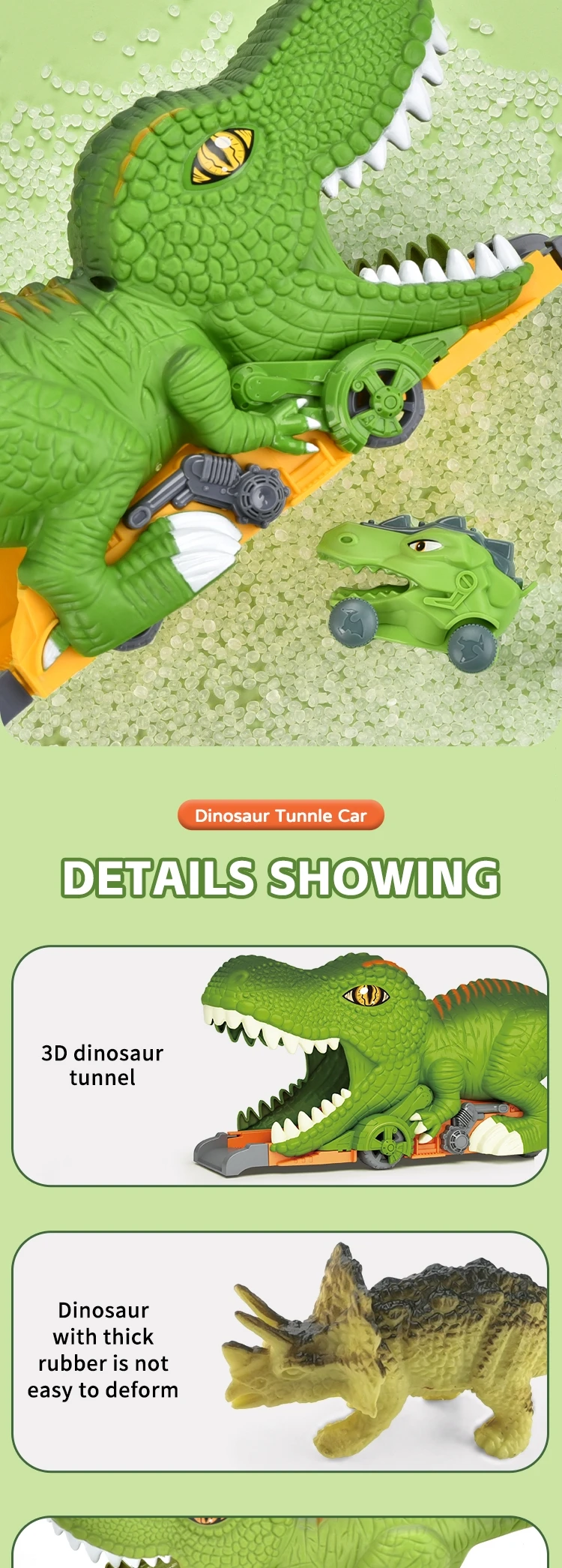 | Packaging Details | 1 piece/ Window Box, 10 pcs/ Carton, can change the quantity per carton, New Arrival Dinosaur Tunnel Car 3D Small Dinosaur Model Kid Inertial Slide Track Friction Toy Vehicle with Egg |