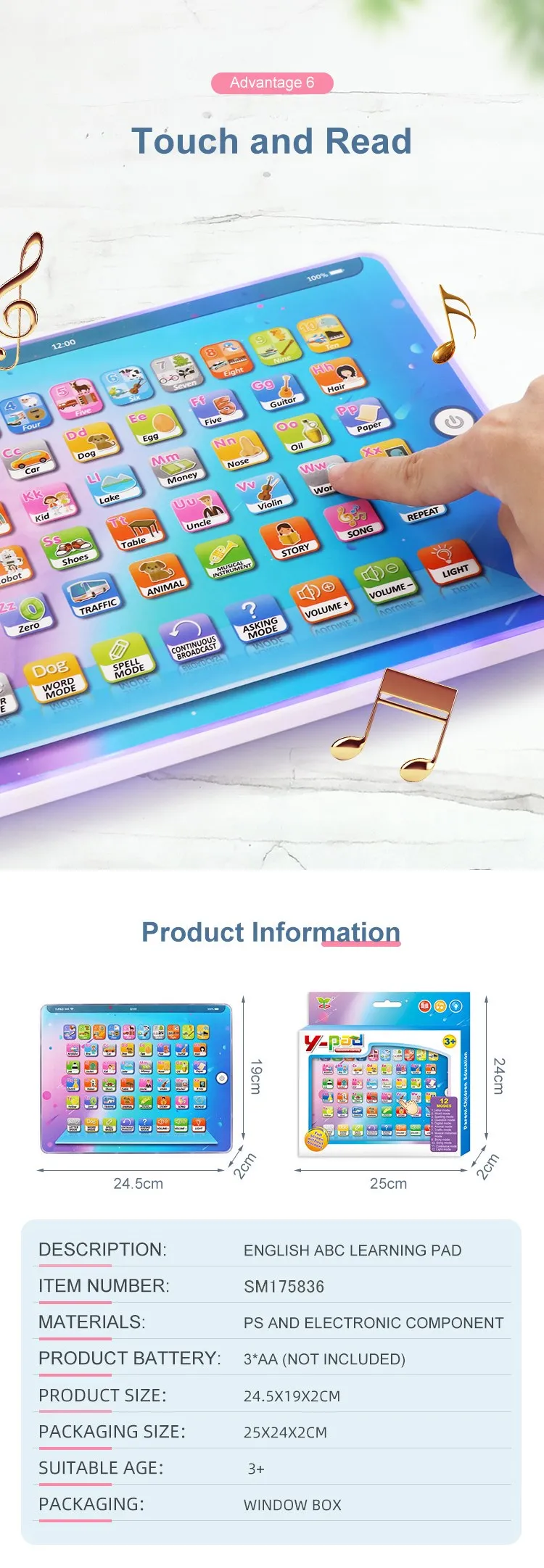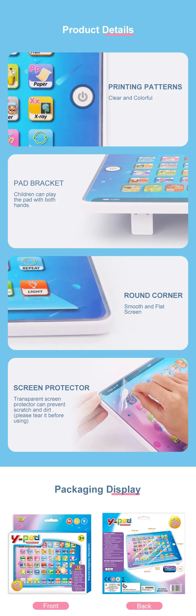 | Packaging Details | 1 piece/ color Box, 48 boxes/ Carton, can change the quantity per carton Funny Farm Ypad thouch Speech Learning Machine Kids Laptops Computer Toys |