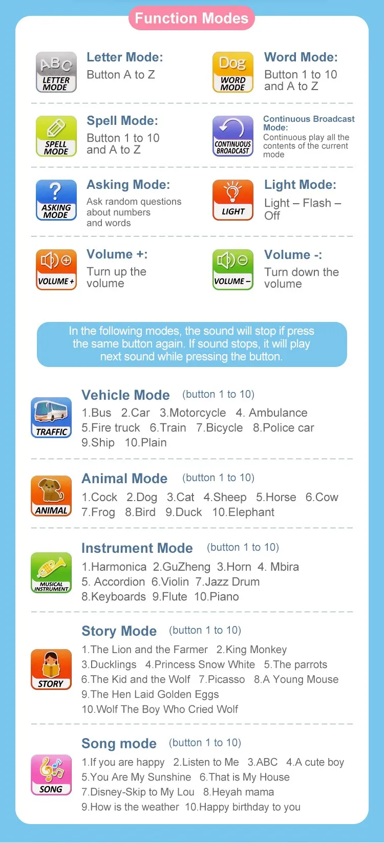 | Function | Letter, word, animal, traffic, question, music, story, light |