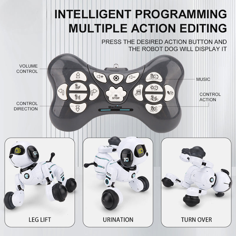 The robot dog has two control methods: app control and remote control. It has forward, backward, left turn, right turn, sit