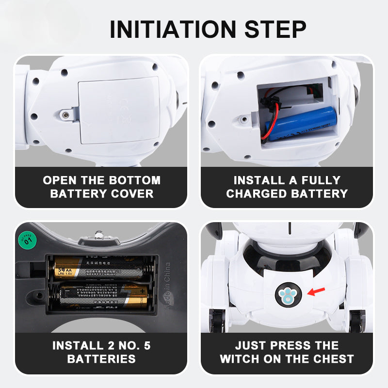 down,stand to attention, roll over, waist twist, Push-up, urination, touch, singing, programming, voice control and other functions. You can also connect your phone Bluetooth to play phone music. 5 meter drive, 2 hours of charging, 45 minutes of useCharging time: 2 hours Working time: 45 minutes Working distance: 5 meters Body:built-in 3.7V lithium battery, 800mAh Controller: 2AA not included Motors: 5 Accessories: remote controller, 1 USB charging cable, manual, screwdriver, voice recognition card |