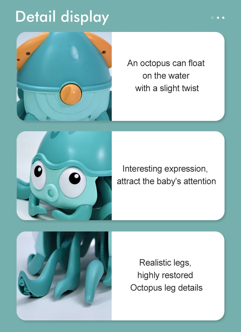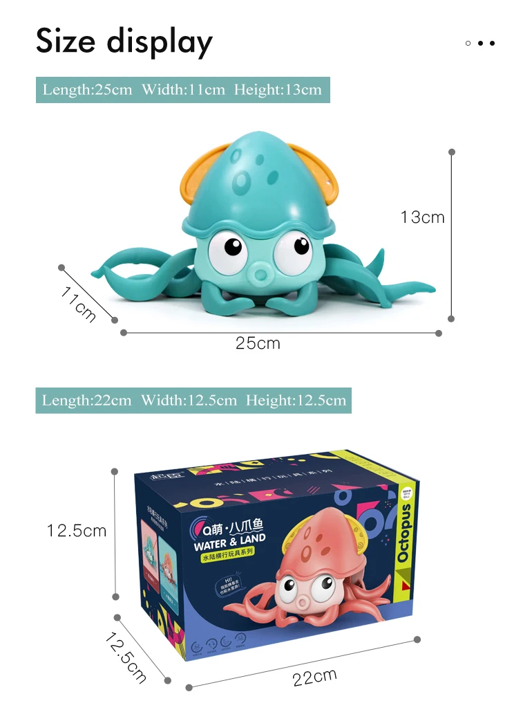 | Packaging Details | 1 piece/color box, 60 pcs/ CartonNew Plastic Wind Up Line Pull Floating Water Crawling Walking Octopus Baby Bath Toy Animal with Water Toys Amphibious |
