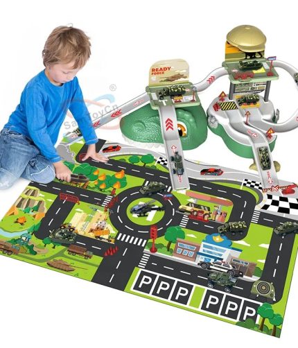 3 IN 1 DIY Suitcase Backpack Car Adventure Toy Storage Parking Lot Game Kids Dinosaur Slot Toy With Military Scene Mat