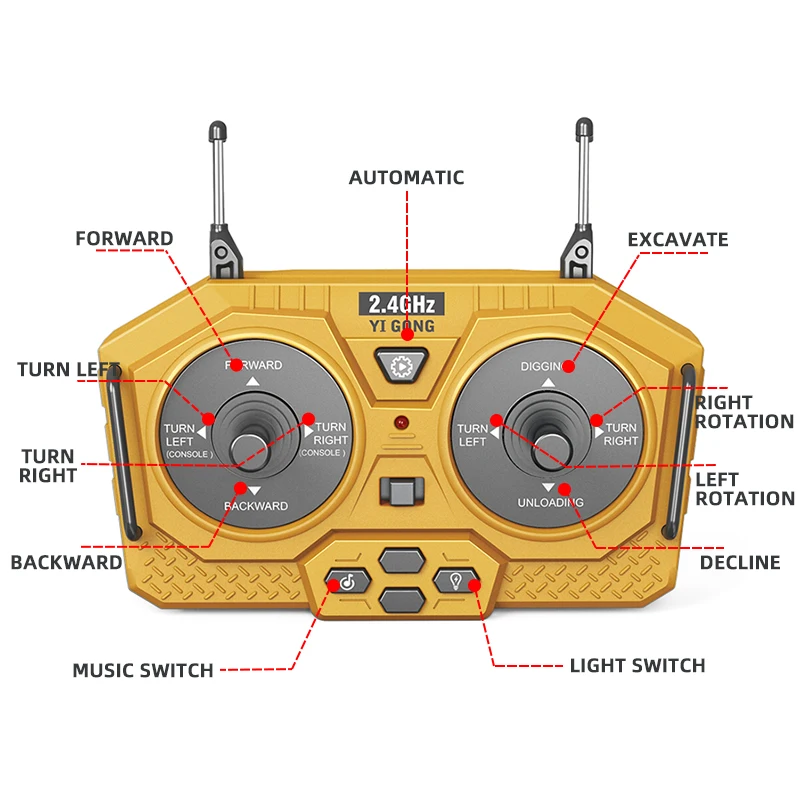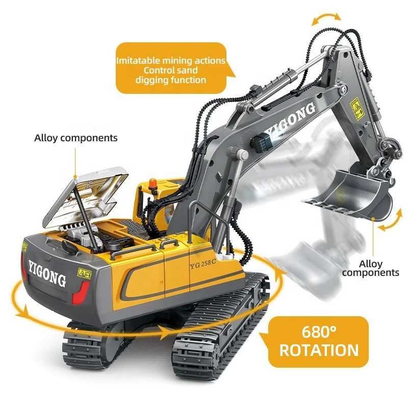 | Features | Forward and backward, turn left and right, 680 degrees of turntable, arm digging and reverse pushing, with sound effect and light |