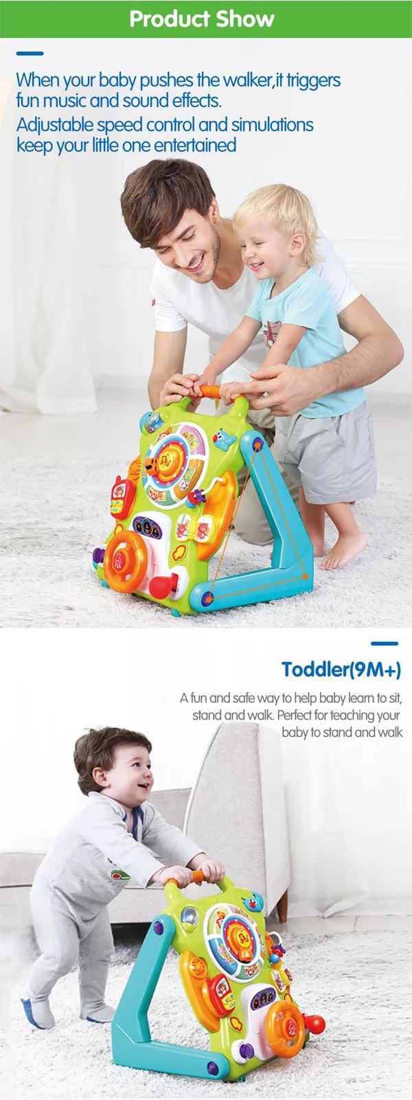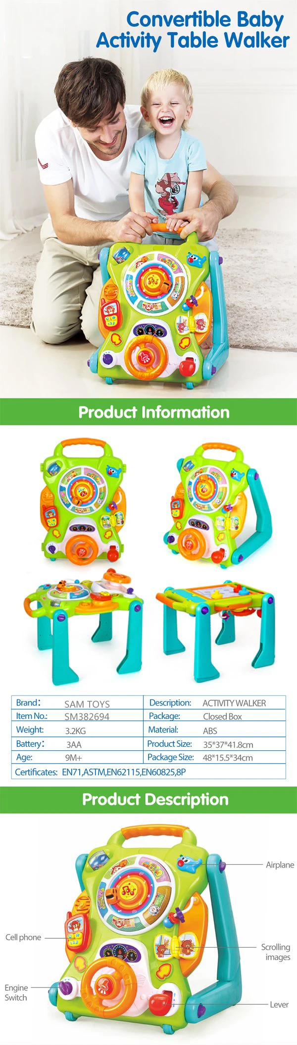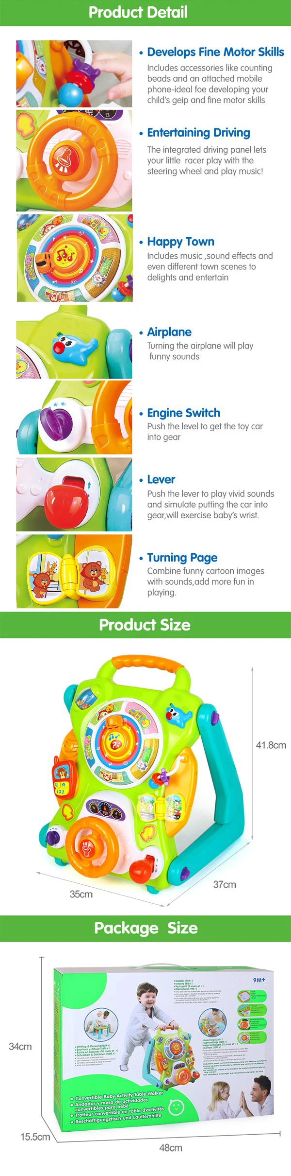 | Function | 3 in 1, walker, activity table, draw board, music, light |