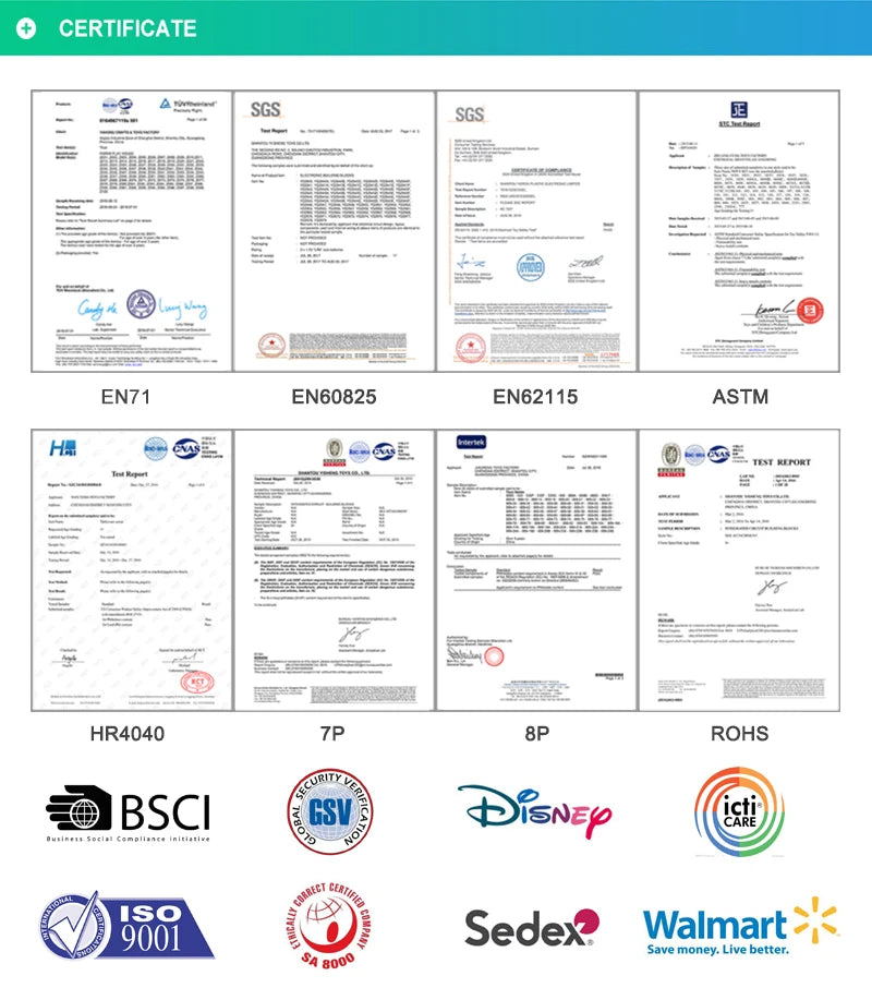We can provide many kinds of certificates, such as EN71, 62115, EMC, R&TTE, Phthalate,Cadmium, ROHS, ASTM, CPSIA, FCC, etc.