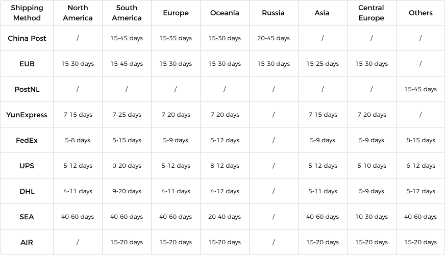 * Please note, this chart is for reference only. Transit time for third-party couriers can be affected by a number of factors beyond ATCMALL’s influence.