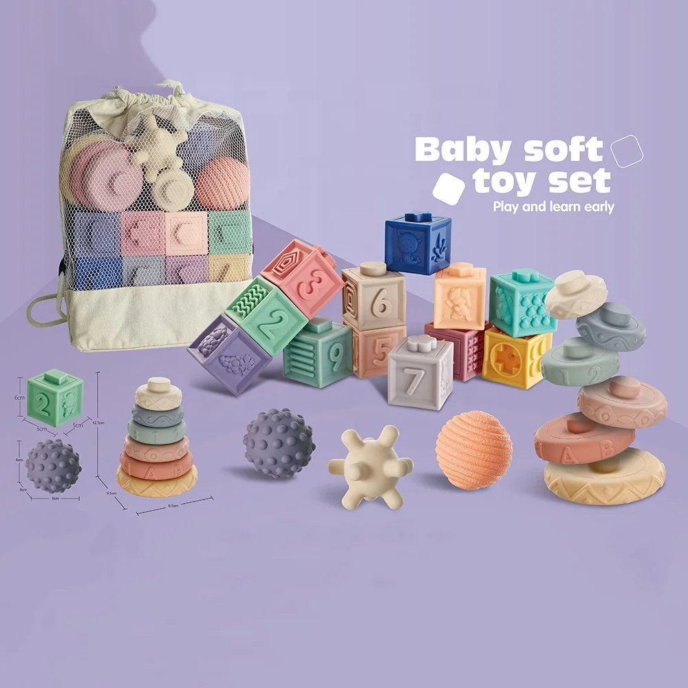 Squeeze Cube Toy Baby Teething Bite Rubber Play Silicone Stacking 3D Embossed Soft Gum Number Building Block for Baby